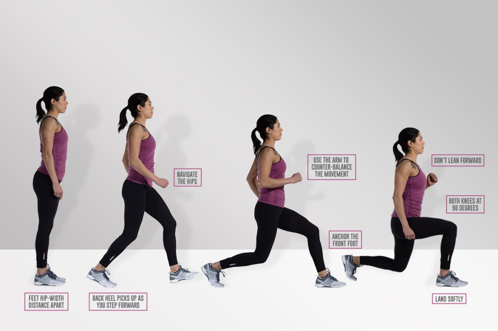 Then take a step forward with your right foot and then slowly bends both knees until your back knee is just above the floor.
