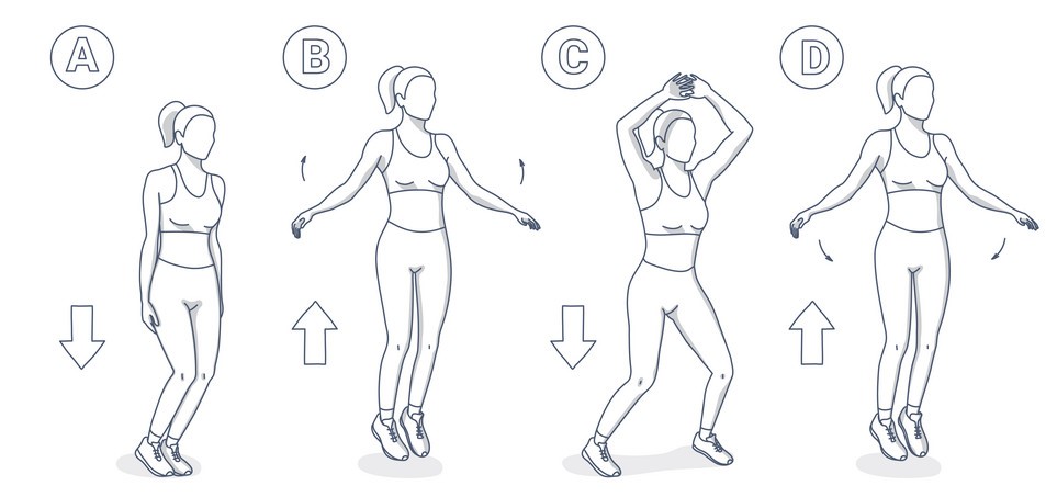 Stand straight with your feet together and hands by your sides. Jump and spread your feet and bring both hands together above your head. Jump again and return to the starting position. Do it for at least 20 seconds.