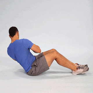 Sit with bent knees, feet touching the floor firmly. Sit back slightly, keeping your back erect and exhale as you twist to the right, touching the floor with your hands lightly, over the right side. Inhale and go back to the starting position and do the same on opposite side.